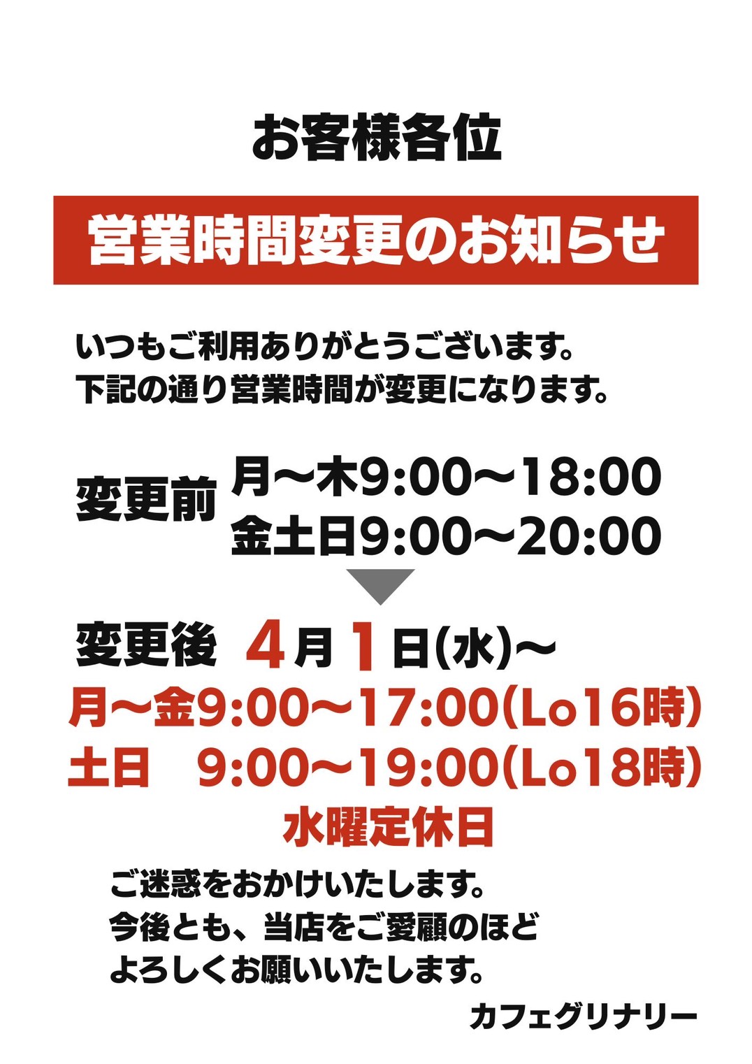 いつもカフェグリナリーをご利用いただき、誠にありがとうございます。 この度、当店では誠に勝手ながら4月1日(水)より、下記の通り営業時間を変更させていただくこととなりました。 お客様にはご不便をおかけいたしますが、何卒ご […]